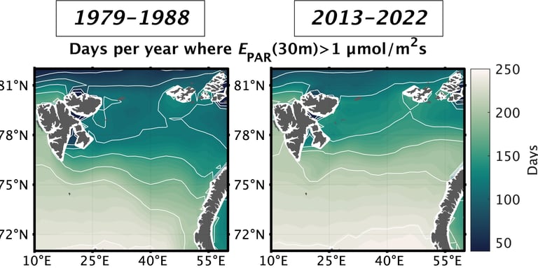 Here, we modelled the year-round underwater light conditions in the Barents Sea over the past four decades. We found that phytoplankton can now start growing one month earlier in the northern Barents Sea, due to sea ice loss that drastically increased underwater light in spring. I led this work, which was mainly done during my 1.5 year research stay at University of Strathclyde in Glasgow.